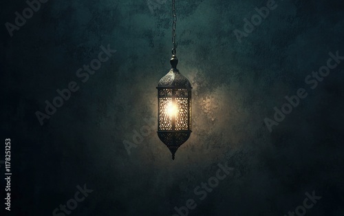 A single hanging lantern with intricate patterns, casting an eerie glow on the dark background, symbolizing Ramadan and Islamic culture. A simple yet powerful depiction of traditional Arabian ornament