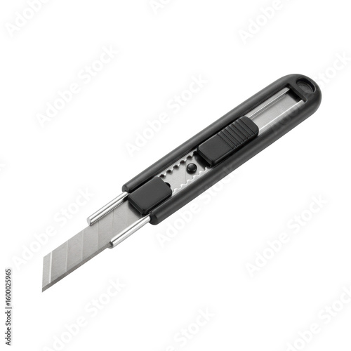 A single hobby knife with a polished silver blade and a sleek black textured handle, isolated against a transparent seamless studio background with no shadows, Concept for precision product display