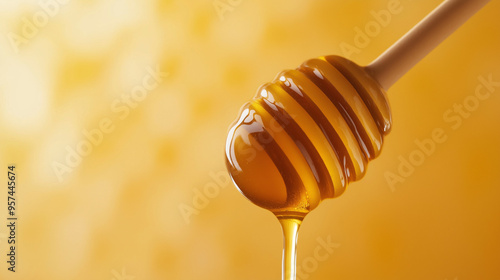 a single honey dipper with dripping honey against an isolated light buttercream background