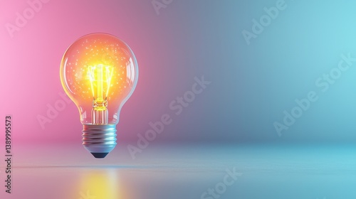 A single illuminated light bulb emanating a warm incandescent glow set against a vibrant gradient background in shades of pink and blue The simple