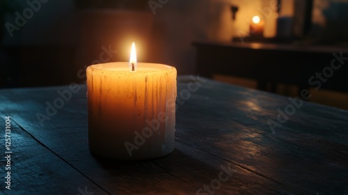 A single lit candle on a dark wooden table, with soft shadows and highlights emphasizing the wax texture and the warm glow of the flame
