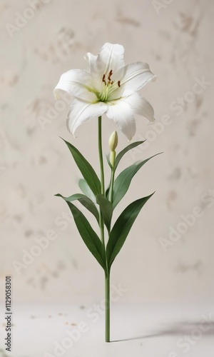 A single long-stemmed white lily standing alone on a white or cream-colored background with some scattered green leaves, solo bloom, white lily