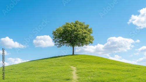 A single, lush green tree stands atop a gentle, grassy hill. The hill is vibrant green, with a small path winding upward. A clear blue sky, dotted with fluffy white clouds, forms the backdrop. The i