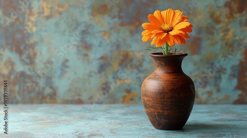 A single orange marigold in a rustic brown Chinese vase with a flared rim, placed on a muted blue-green textured surface. Warm and inviting.