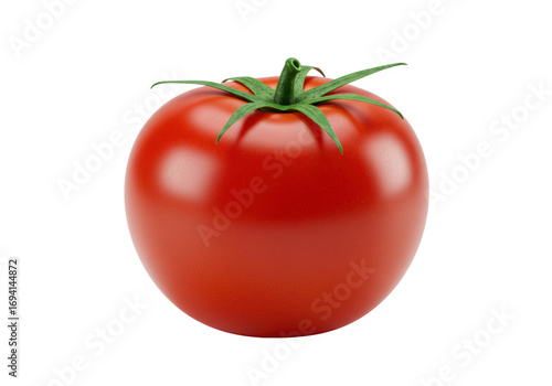 A single, perfectly ripe red tomato with vibrant skin and a healthy green stem, isolated on a transparent background in a professional studio setup, concept of fresh wholesome ingredients