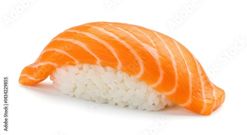 A single piece of fresh salmon nigiri sushi, ready to be enjoyed, isolated on a white surface.