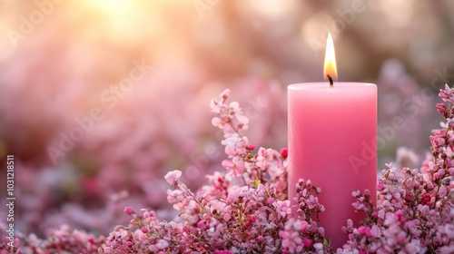 A single pink candle burning brightly in a field of pink flowers with a warm sunset glow in the background.
