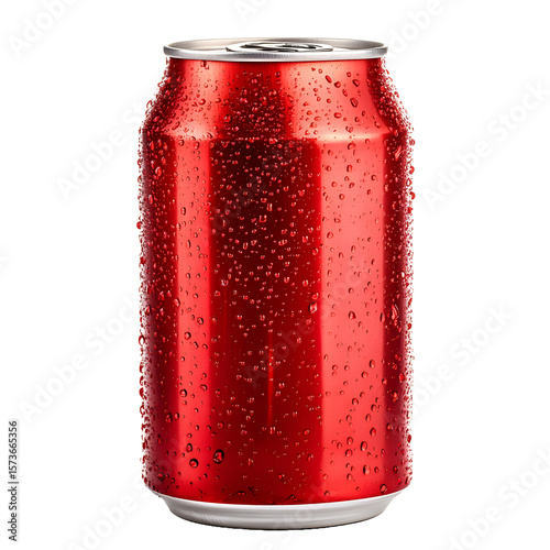 A single red aluminum beverage can covered in condensation droplets isolated on a transparent background isolated on transparent background