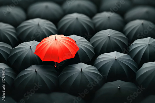 A Single Red Umbrella - A vibrant red umbrella stands out amongst a sea of black umbrellas, symbolizing individuality, uniqueness, courage, defiance, and standing out from the crowd.