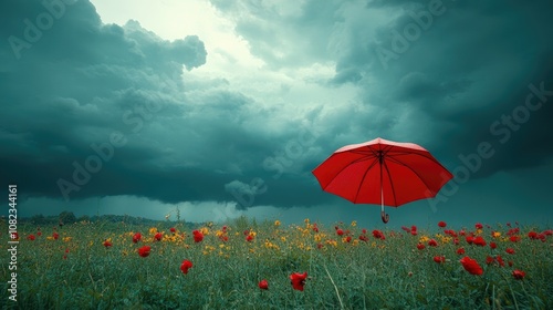 A single red umbrella stands in a field of red poppies with a dark stormy sky overhead.