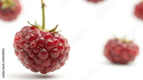 A single ripe berry falls against a pure white background, side view, red, gravity