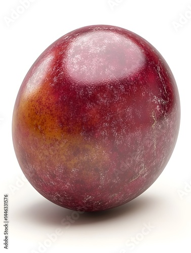 A single ripe plum with reddish-purple skin and subtle orange hues sits isolated on a pure white background.