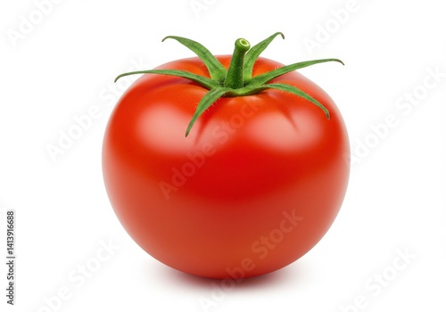 A single ripe red tomato with green stem and leaves isolated on a plain white background in studio shot