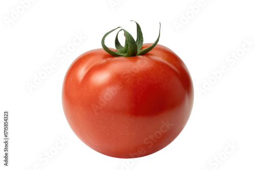 A single, ripe red tomato with its green stem, isolated on a transparent background. background removed