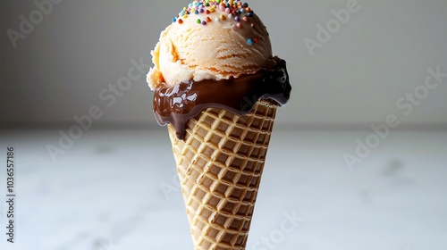 A single scoop of vanilla ice cream in a waffle cone with a chocolate drizzle and sprinkles.