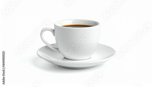 A single serving of dark coffee rests in a simple white cup and saucer.