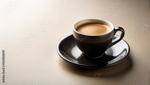 A single serving of dark roasted coffee in a dark ceramic cup sits on a matching saucer, a moment of quiet contemplation