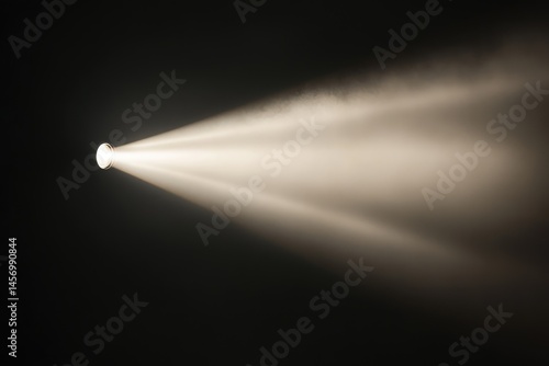 A single spotlight beam emanates from a source on the left, illuminating dust particles in the darkness.