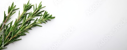 A single sprig of fresh rosemary, vibrant green, aromatic and rustic, isolated on white background