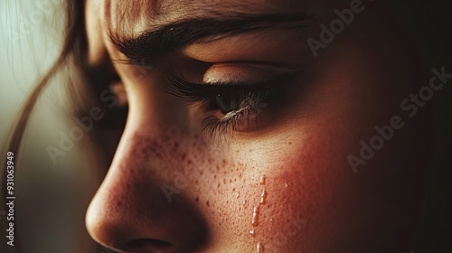 A single tear rolling down a cheek, captured in minimalist style, with a soft, neutral backdrop highlighting the raw emotion.