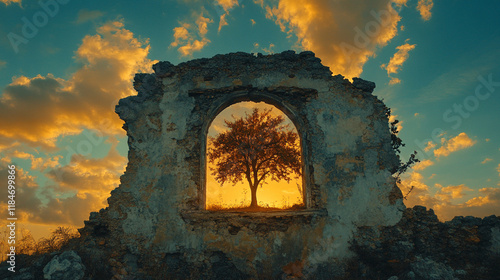 A single tree branch reaches out from a cracked window symbolizing nature's strength and resilience, reclaiming space from human-made chaos with blurred caption space to evoke mystery and depth