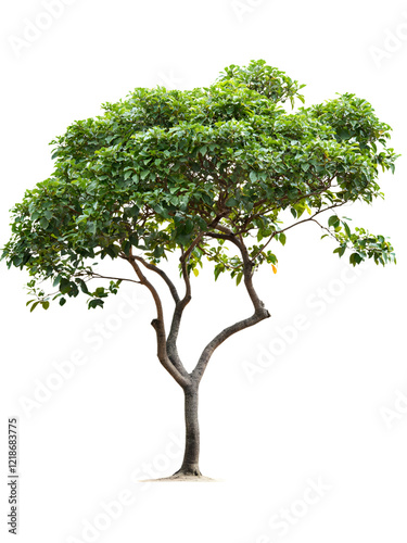 a single tree with green leaves and a thick, gnarled trunk on transparent background, cut out, PNG 3D Digital Art.