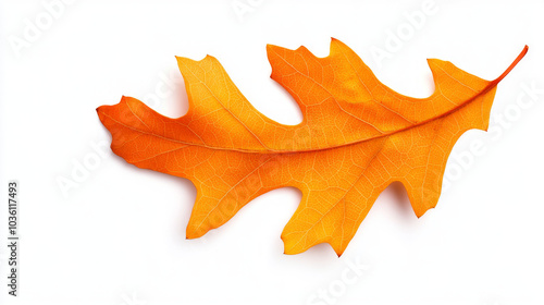 A single, vibrant orange oak leaf isolated on a white background.