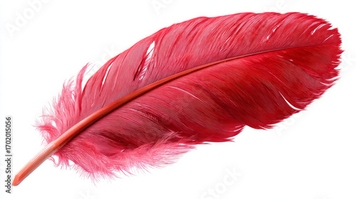 A single vibrant red feather isolated on a white background showcasing its delicate texture and vibrant color