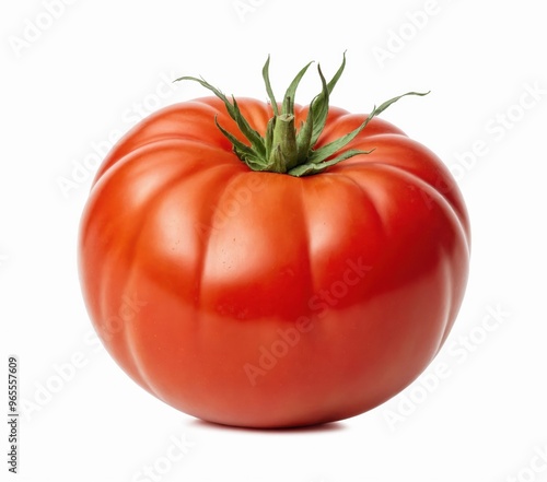 A single, vibrant red tomato with a curved, textured skin and green stem is centrally positioned against a white background, showcasing its natural beauty and simplicity