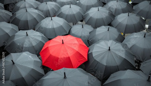 A single vibrant red umbrella stands out prominently in a dense collection of grey umbrellas, vividly symbolizing individuality, distinction, and uniqueness amidst conformity