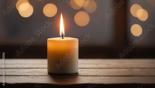 A single white candle sits on a wooden table with a soft, warm glow. The background is blurred, showcasing out-of-focus lights, copy space