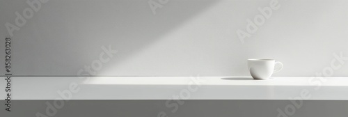 A single white cup sits on a white countertop in a minimalistic setting. Soft light casts a gentle shadow on the surface