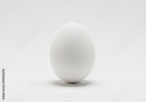 A single white egg is centered on a white surface with a bright neutral background in a studio setting