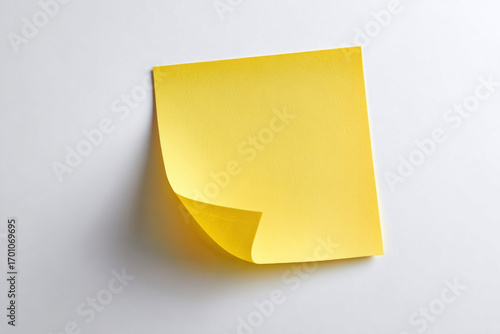 A single yellow sticky note curls at the corner on a clean white surface, highlighting simplicity, organization, and the potential for quick ideas, reminders, and planning.