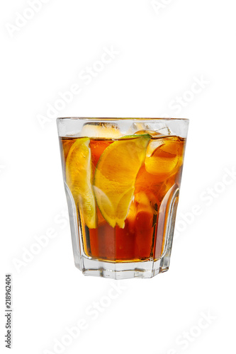 A single-colored transparent cocktail, refreshing in a low glass with radiant ice cubes with taste of berries, cola and slice, lime quartet. Side view Isolated white background