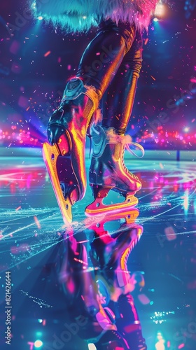 A skating rink illuminated with bright colorful lights and stage reflections. Ice Rink Background. Copy space. Winter poster for hockey competitions. Ice skating. Stadium.