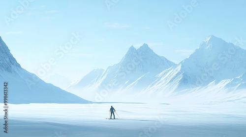 A skier gliding effortlessly across a wide open snowfield, with distant mountain ranges and clear skies