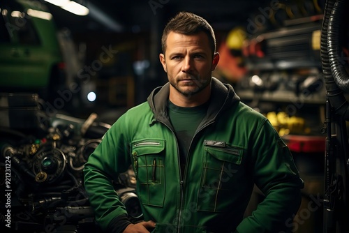 A skilled mechanic stands confidently in an auto repair shop, surrounded by tools and equipment, showcasing expertise in vehicle maintenance.