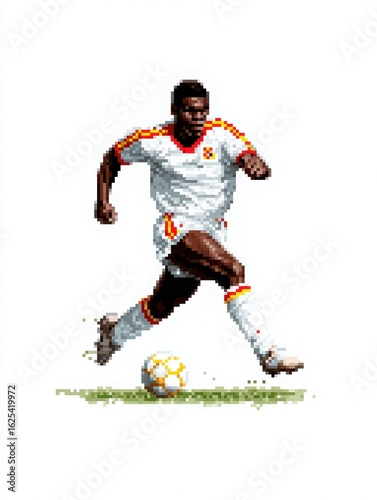 A skilled soccer player runs with determination across the grass field, wearing a white jersey with colorful accents.