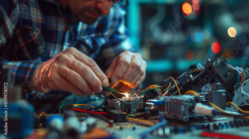 A skilled technician carefully repairs a circuit board in a workshop, using specialized tools to troubleshoot and fix electronic components.