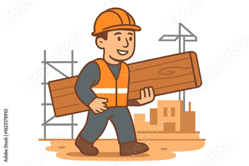 A skilled tradesperson is constructing buildings using wooden beams and various tools
