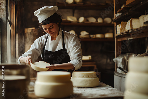 A skilled woman cheesemaker, dressed in a white uniform and black apron, is in the process of making cheese in a rustic dairy workshop. She is surrounded by cheese wheels, milk containers