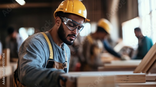 A skilled worker in safety gear focuses on a wooden project in a busy workshop, showcasing craftsmanship in a professional environment.