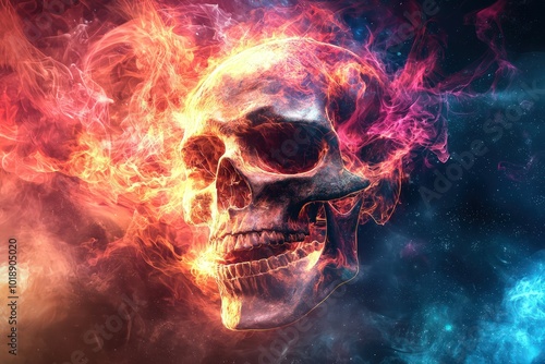 A skull surrounded by vibrant flames, portraying a dramatic and intense visual effect.