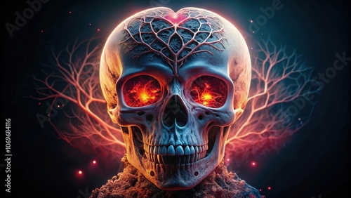 A Skull With Fiery Eyes and Branching Veins
