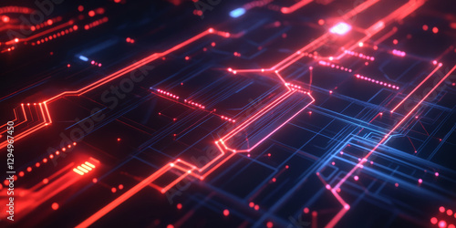 A sleek 3D abstract background with glowing energy circuits forming an intricate neon web. The high-tech reflections and futuristic lighting enhance the cyberpunk-inspired design.