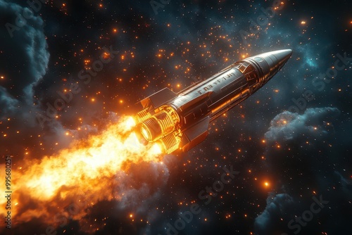 a sleek 3d rocket soaring through a starry space backdrop symbolizing innovation and the growth of startups in a visually striking and inspiring way