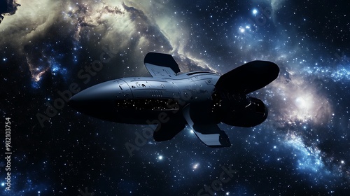 A sleek advanced spaceship cruising through the vastness of space with distant galaxies and stars in the background