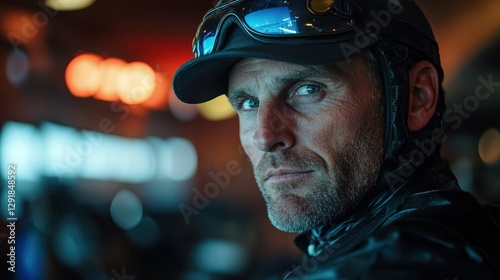 A sleek and determined racer wearing specialized gear stands poised at the starting line, ready to accelerate into the race with a fierce competitive spirit.