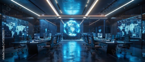 A sleek and modern business office setting with state-of-the-art technology inventions lining the walls, including advanced security systems, AI-powered assistants, and cutting-edge communication devi